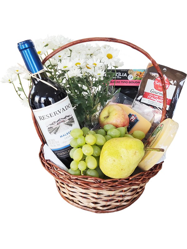 Uma combinação perfeita de queijos, salame, uma garrafa de vinho selecionado e frutas frescas. Uma experiência premium completa e um presente sofisticado para qualquer ocasião especial. A cesta agrada até os paladares mais exigentes! Acompanha um lindo vasinho de margaridinhas.