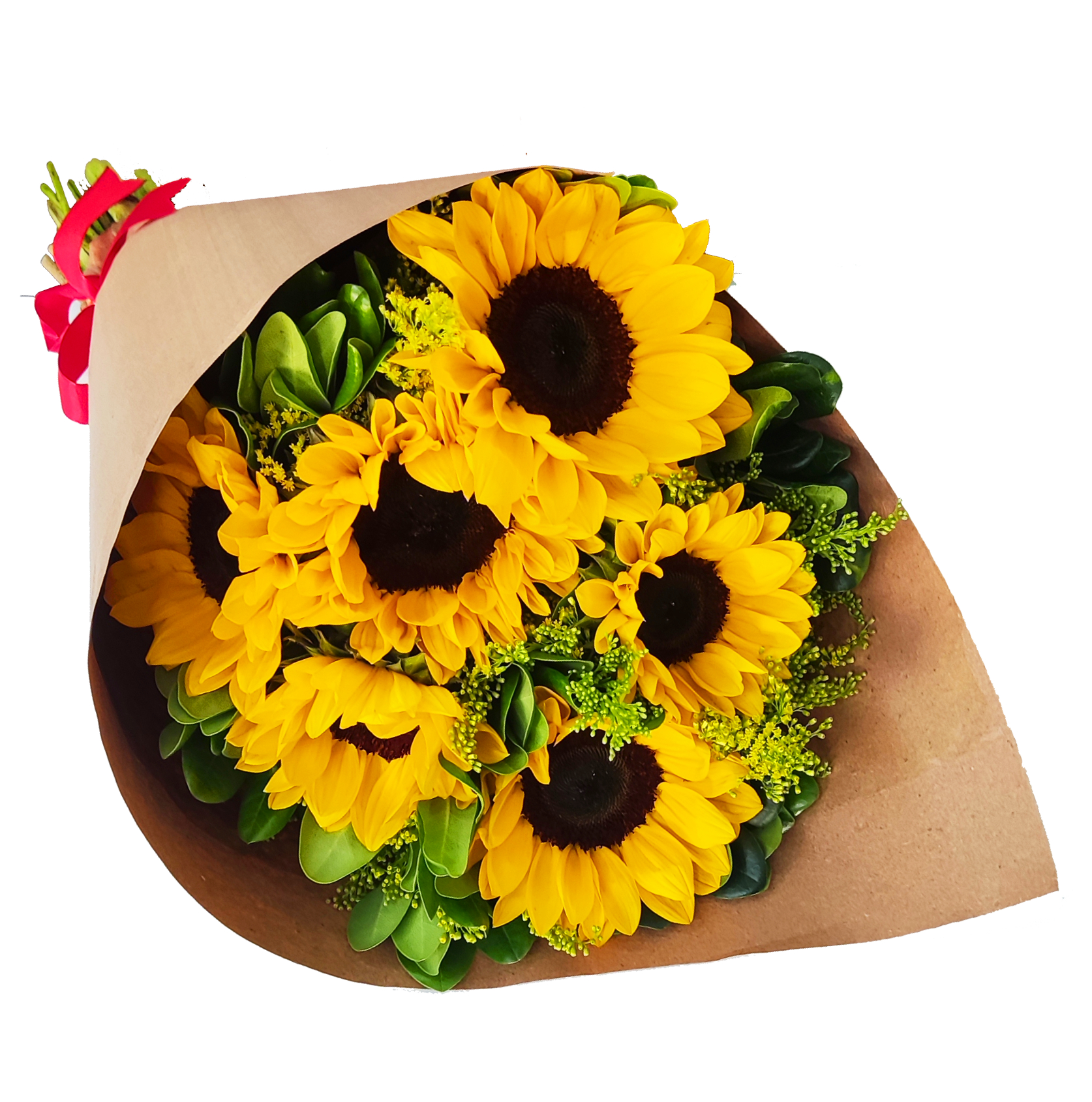Seis girassóis envoltos em um elegante cone, presente perfeito para iluminar o dia de alguém especial.